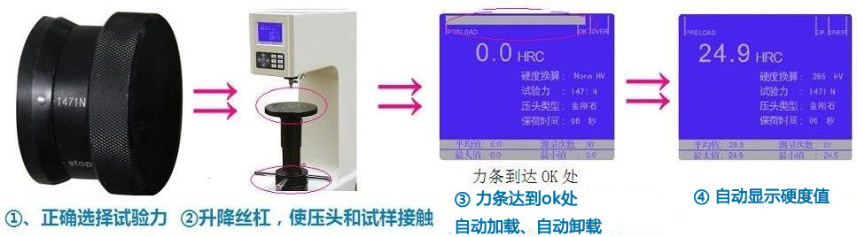 操作步驟:壓頭和樣品接觸,光標(biāo)到“OK”處,自動(dòng)加載、自動(dòng)保荷、自動(dòng)卸載,自動(dòng)顯示硬度值,分辨率0.1HR;
