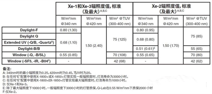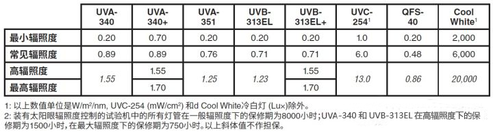 有太陽眼輻照度控制系統的設備可以設定輻照度水平。例如, 對于 UVA-340燈管, 設定0.89W/m2@340nm的輻照度和夏天正午時光強相當。為了更快地得到測試結果,紫外老化箱QUV可被設置在夏天正午光強200%條件下運行?;诓煌瑹艄茴愋拖卤砹谐鲎罡咻椪斩人郊耙恍┏S玫妮椪斩仍O置點。