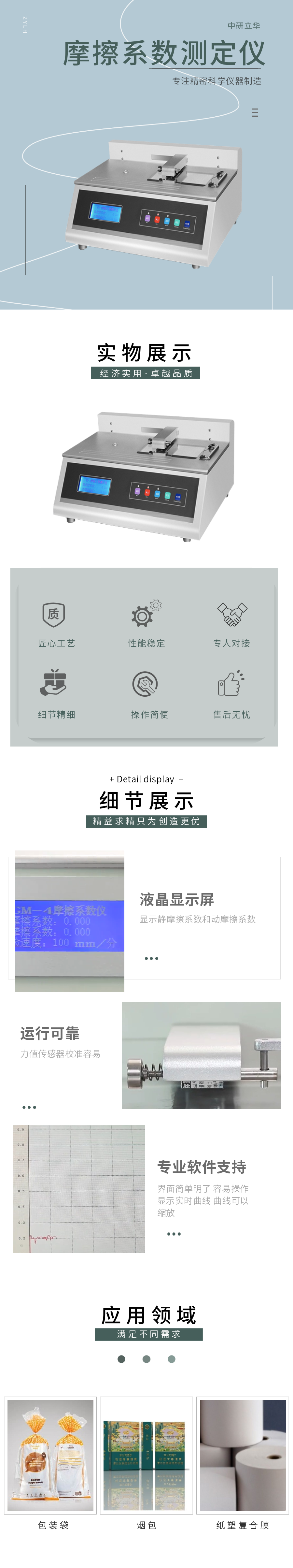 用途:摩擦系數(shù)測定儀用來測定塑料薄膜、薄片、紙張等材料在自身或其他材料表面滑動(dòng)時(shí)的摩擦系數(shù),應(yīng)用于質(zhì)檢、藥檢、科研、包裝、薄膜、食品、藥品、日化等行業(yè)。