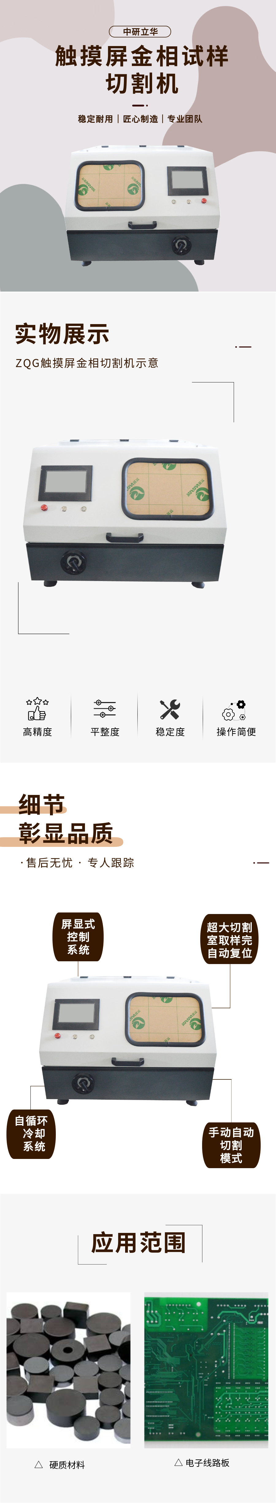 用途:本機采用高速旋轉的薄片增強砂輪來切取試樣。因切割不同的試樣而對切割速度進行設定,從而提高切割試樣的質量。該機分為手動和自動切割。是大專院校、工廠企業金相試驗必備的制樣設備