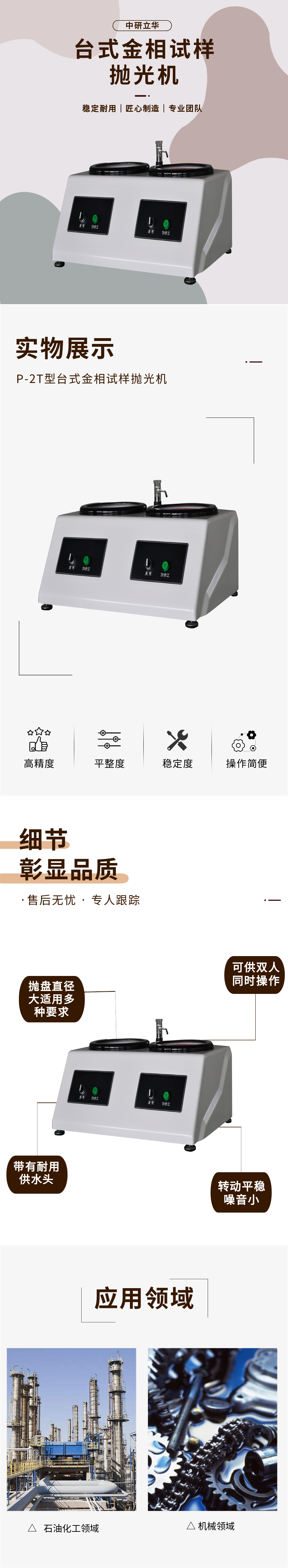 用途:在金相試樣制備過程中,試樣的拋光是一道主要工序,經過磨光的試樣,在拋光機上拋光后,可獲得光亮如鏡的表面。該機可供雙人同時操作,拋光盤直徑與傳遞功率均大于國內同類產品。