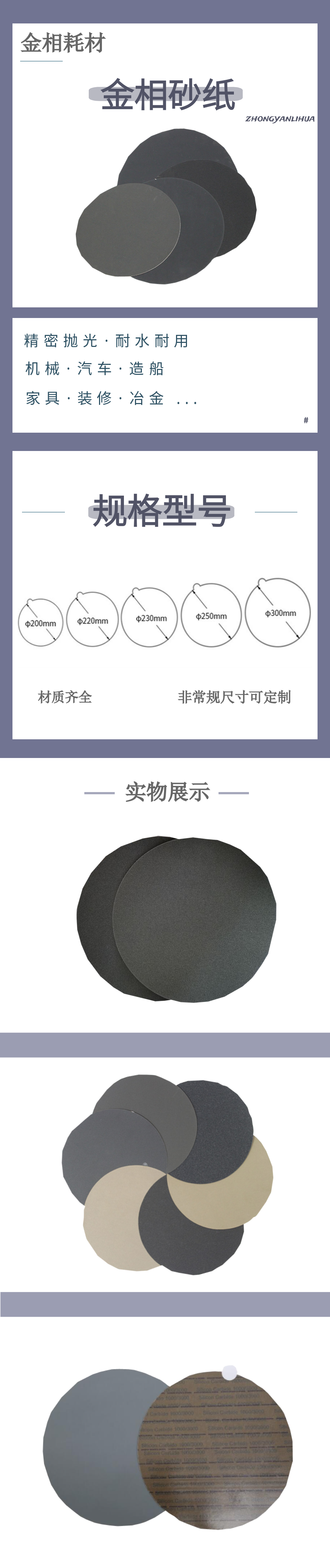 用途:專門為金相試樣制備研磨而設(shè)計的各種規(guī)格碳化硅耐水研磨砂紙,配合各種研磨機(jī)械用的圓形、條形的砂紙。黑色和有色金屬的金相試樣之粗磨、精磨、超精磨,即可干磨亦可濕磨,方便靈活。