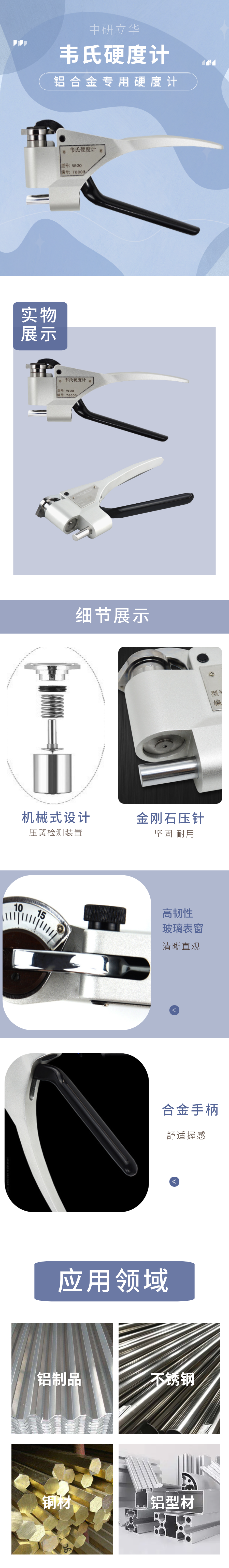 用途:適于檢測鋁合金型材、管材和板材、鋁工件及其他軟金屬硬度。適于生產(chǎn)現(xiàn)場、銷售現(xiàn)場或施工現(xiàn)場對產(chǎn)品硬度進行快速、非破壞性的合格檢查。